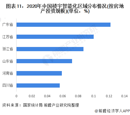 根据国家统计局2020年各省市房地产投资数据,目前楼宇智能化市场主要集中在广东、江苏、浙江、山东、河南和四川地区,占比分别为12.2%、10.0%、8.7%、7.2%、5.9%和5.6%。