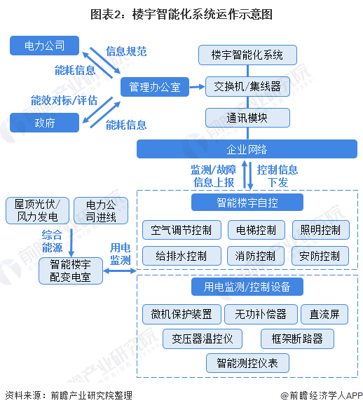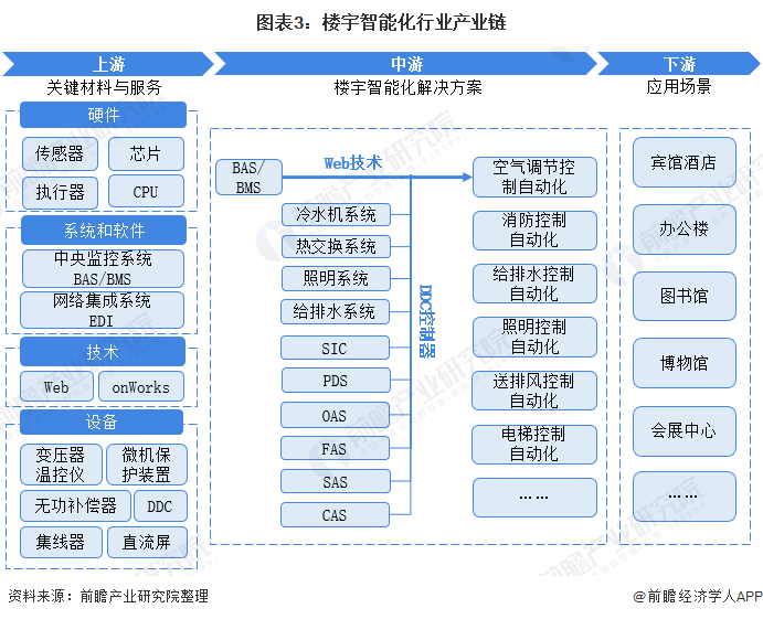 中国楼宇智能化行业产业链整体呈现日趋完善且下游应用场景逐渐增多的特征。行业的上游主要为关键材料和服务;包含硬件、系统和软件、技术及设备等;值得注意的是系统和软件主要指楼宇智能化系统的中央监控系统(BAS/BMS)和网络集成系统(EDI),而技术主要是指系统内部和系统间信息的输入输出技术,目前主要的信息传输仰赖Web和onWorks技术。行业的中游主要是楼宇智能化系统的整体运行和监控,系统内部通过配有微处理机芯片的DDC分站进行指令下达,DDC执行器可以独立完成所有控制工作,具有完善的控制、显示功能,进行节能管理,可以连接打印机、安装人机接口等,最终达成空调送风、给排水和消防控制自动化等功能。行业的下游应用场景近几年逐渐增多,目前系统可以应用于宾馆酒店、办公楼、图书馆和博物馆等场景。