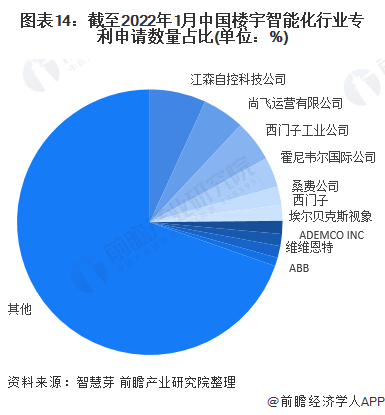 截至2022年1月6日,在专业专利检索平台智慧芽检索“楼宇智能化”、“智能楼宇”和“楼宇自控”等关键词,中国楼宇智能化行业专利申请数量排名前五的公司分别是江森自控、尚飞运营、西门子、霍尼韦尔和桑费公司,且前十企业均为外企。目前,仅有江森自控、尚飞运营和西门子的累计专利申请数量占比超过5%。综合来看,中国楼宇智能化行业潜在市场较大,企业竞争十分激烈,国外企业占据行业的领先地位。