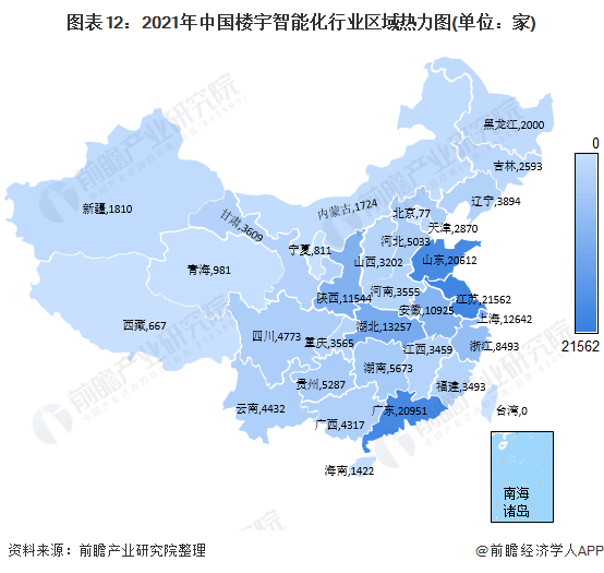 另外,据2022年1月6日,企查猫搜索关键词“楼宇智能化”,选择存续在业的楼宇智能化经营范围相关企业得到189233家相关业务企业,其中江苏省分布最多,共有21562家,其次为山东省和广东,分别为20612家和20951家。